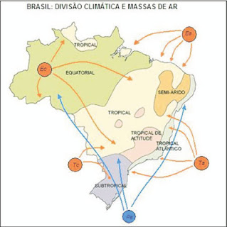 - Massa Tropical atlântica (mTa) – Quente e úmida, originária do oceano Atlântico nas imediações do trópico de Capricórnio ( que passa pela cidade de São Paulo), tem uma enorme influência sobre a parte litorânea do Brasil (do nordeste até o sul).